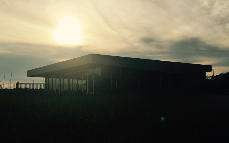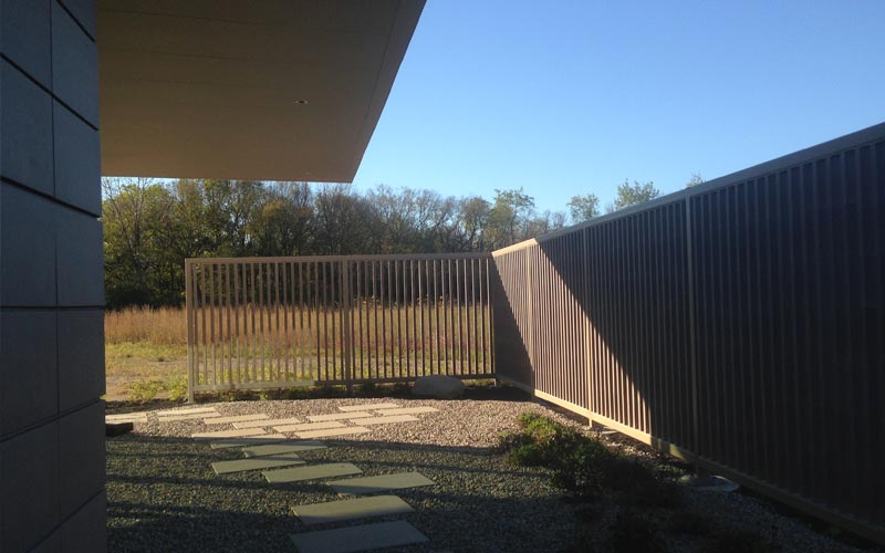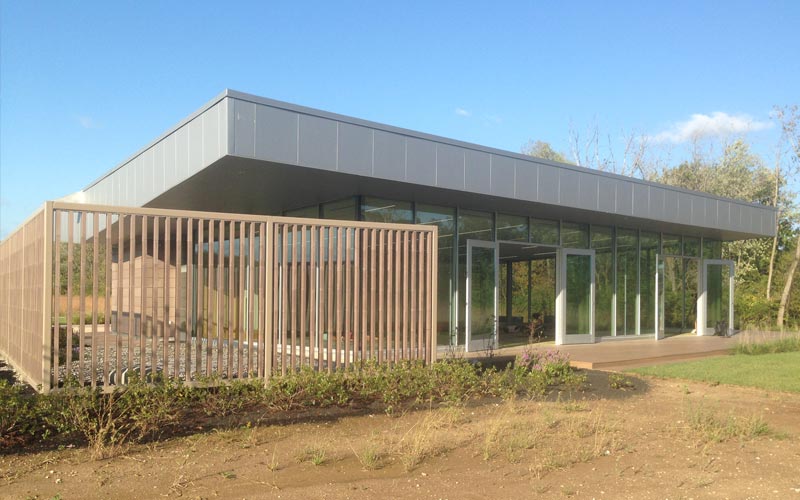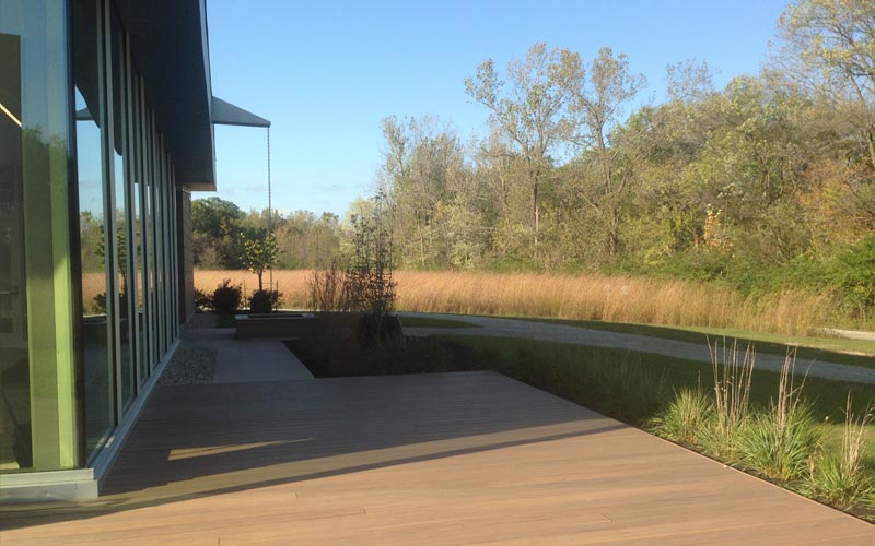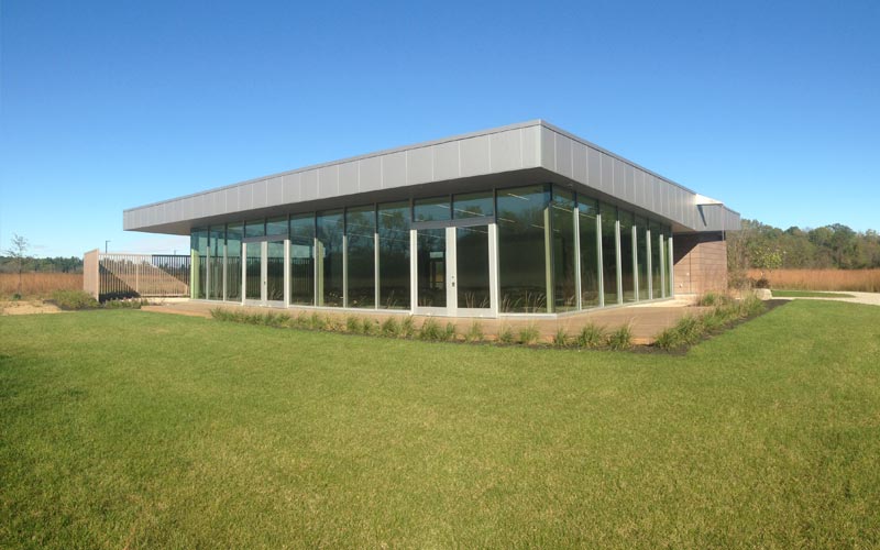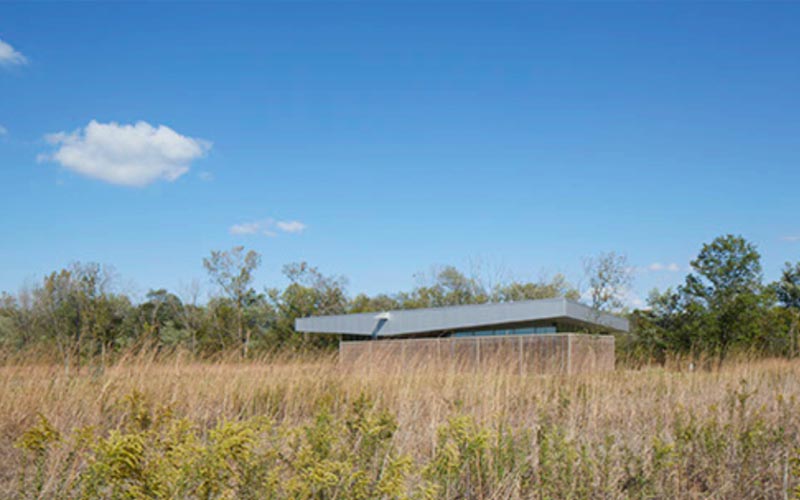 The multi-purpose venue responds to this goal as a vertical landscape that reflects Scioto Grove ecosystem with walls of glass andsimple openings in the exterior form creating intimate courtyards for nature to flow in, around and through the building. The unique roof form appears to float above the tall prairie grasses to the west and support the tree canopy of the Scioto River escarpment to the east. As the seasons transition this iconic roof form will not only float above the prairie, but also nest in place when viewed up-close by guests and visitors. A key component of the building's west facade is a terra cotta biscuit screen wall designed to create a hierarchical sequence as one views, approaches and then enters the building. As visitors circulate through the building, this simple design motif creates a variety of opportunities to experience filtered space and sun light without the inconvenience of direct glare.